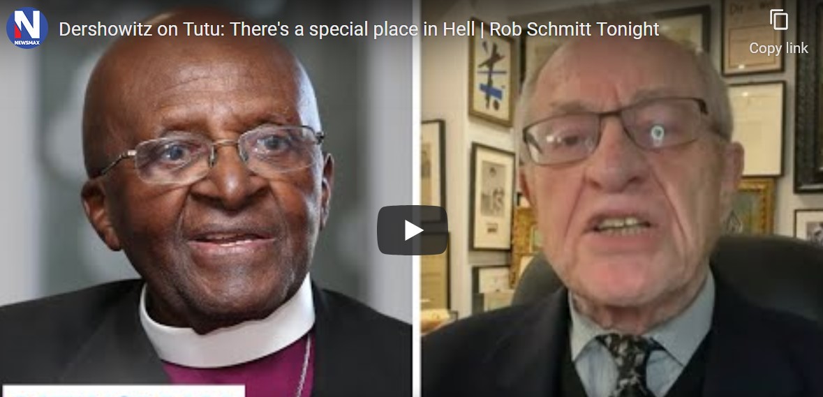 Dershowitz: Tutu is daarvan de hoofdoorzaak, hij legitimeerde het, hij maakte het acceptabel en er is een speciale plaats in de hel voor mensen zoals hem die hun bekendheid gebruiken om antisemitisme te promoten. Hij verdient het om geprezen te worden voor het goede dat hij deed, maar hij moet veroordeeld worden voor het kwaad dat hij in de wereld heeft aangericht. Ondanks de eigen verklaringen van Tutu, huldigt de liberale pers zich in zwijgen.