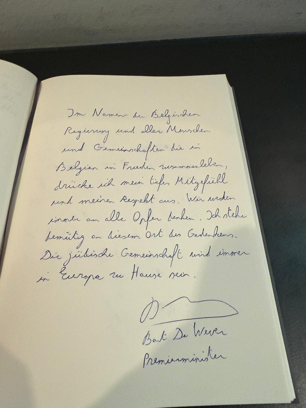 Tijdens een bezoek aan Berlijn op dinsdag 26 augustus heeft eerste minister Bart De Wever een pakkende boodschap achtergelaten in het gastenboek van het Monument voor de vermoorde Joden van Europa (Holocaustmonument in Berlijn). In zijn tekst, geschreven in het Duits, betuigde De Wever de steun en het respect van België aan de Joodse gemeenschap en herdacht hij de miljoenen slachtoffers van de Shoah.